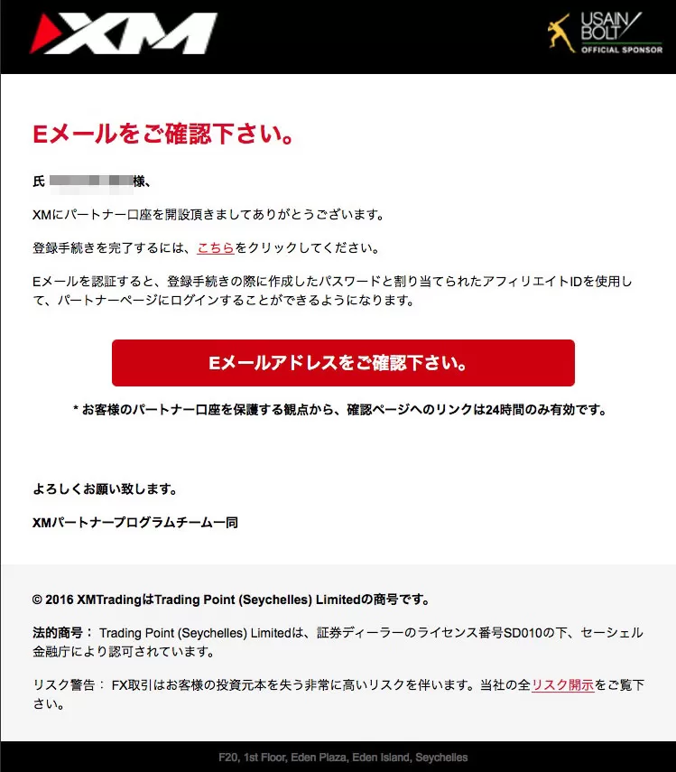 情報を送信するとXM側からアフィリエイトパートナー認証のメールが届きます。